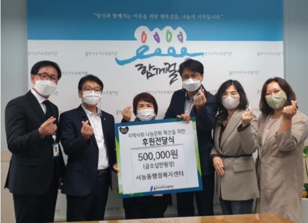 [뉴스시선집중, 이학범기자] 용인시 기흥구 서농동은 28일 주민자치위원회(위원장 금길순)가 수지노인복지관에 50만원을 기탁했다고 밝혔다.
