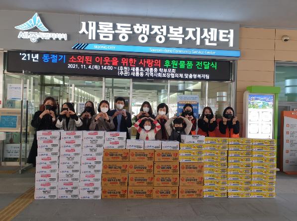 후원물품은 120만 원 상당 라면 33박스, 즉석밥 33박스, 컵밥 15박스로, 새롬동은 후원물품을 한부모 가족, 독거노인, 장애인, 저소득 가정 등 취약계층 30가구를 찾아 안부를 살피며 직접 전달했다.