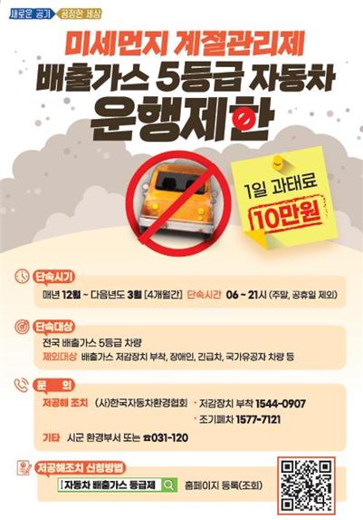 [뉴스시선집중, 박광옥기자] 광명시는 12월부터 내년 3월(주말, 공휴일 제외)까지 ‘계절관리제 운행제한’을 시행한다.