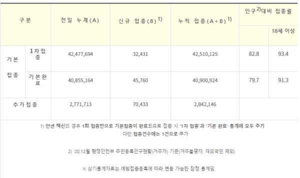 [뉴스시선집중, 김강산기자] 코로나19 예방접종 대응 추진단(단장: 정은경 청장)은 11월 28일 0시 기준으로 1차 접종은 32,431명으로 총 42,510,125명이 1차 접종을 받았고, 이 중 45,760명이 기본접종을 완료하여 총 40,900,924명이 기본접종을 완료하였다고 밝혔다.