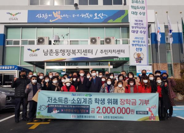 [뉴스시선집중, 박광옥기자] 오산시 남촌동(동장 최원배)은 남촌동통장단협의회(회장 최재식)에서 지난 9일 어려운 학생들을 위한 장학금 200만원을 전달했다고 전했다.