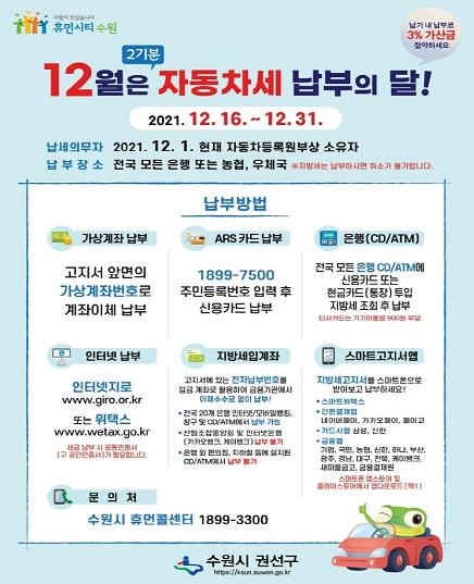 기타 자세한 사항은 수원시 휴먼콜센터 및 권선구청 세무과 자동차세 담당자로 문의하면 된다.