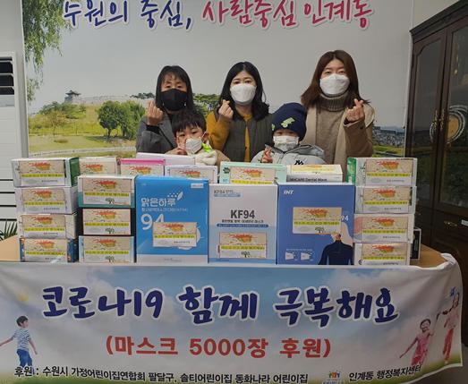 [뉴스시선집중, 윤금아기자] 인계동행정복지센터는 지난 14일 팔달구 가정어린이집 연합회 소속 솔티어린이집과 동화나라 어린이집으로부터 취약계층을 위한 보건용 마스크 5000장을 전달 받았다고 밝혔다.