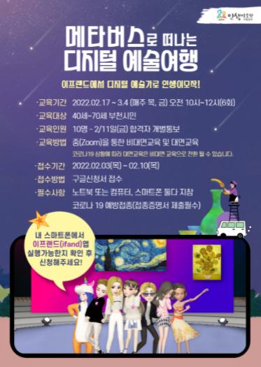 이번 교육은 2월 17일부터 11월 26일까지 총 6회에 걸쳐 디지털 코칭 전문인 이티랩(ETlab)의 주혜정 강사 강의로 진행되며, 메타버스 세계와 아바타를 이해하고 여러 디지털 예술 분야를 체험한 후 메타버스 공간에서 자신의 작품을 발표하며 새로운 가상세계를 경험할 수 있다.