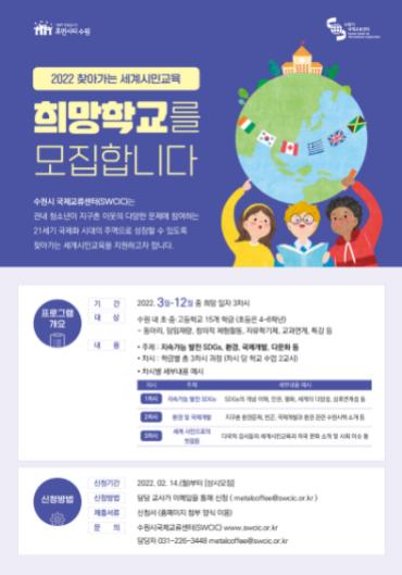 [뉴스시선집중, 윤금아기자] 수원시국제교류센터가 ‘2022년 찾아가는 세계시민교육’ 프로그램에 참여할 15개 학급을 선착순으로 모집한다.
