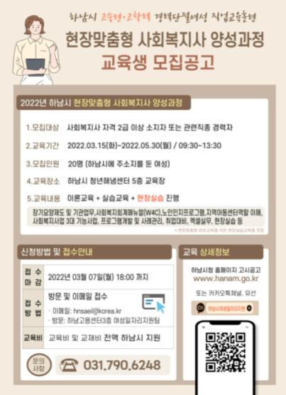 [뉴스시선집중, 이학범기자] 하남시가 고학력·고숙련 경력단절 여성의 취업지원 확대를 위해 ‘현장맞춤형 사회복지사 양성과정’교육생을 모집한다.
