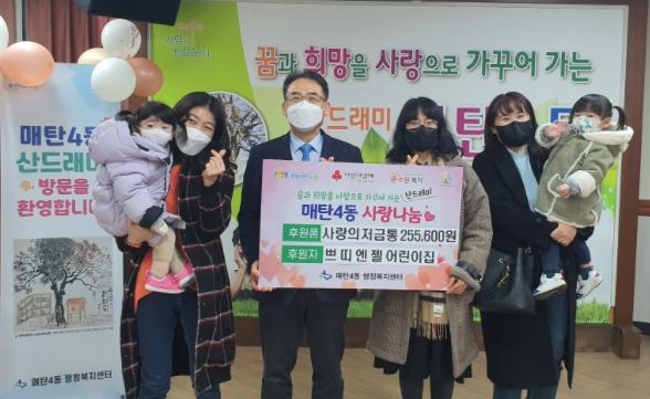 [뉴스시선집중, 윤금아기자] 지난 22일 매탄4동 소재 쁘띠엔젤 어린이집은 지난 2개월간 ‘사랑의 저금통’행사를 통해 원생들이 모금한 155,600원과 원장의 성금 10만원을 더해 총 255,600원의 후원금을 행정복지센터에 기부했다.