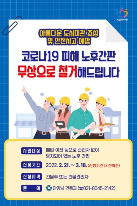 최대호 안양시장은 “위험에 노출된 주인 없는 간판을 정비해 안전하고 쾌적한 도시환경을 조성하고자 한다. 아울러 코로나19로 피해가 많은 소상공인을 돕는데도 힘쓰겠다”고 전했다.