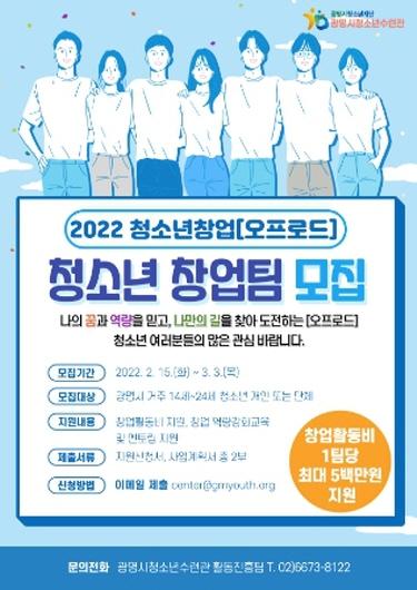 [뉴스시선집중, 박광옥기자] 광명시 청소년수련관은 코로나19의 어려움 속에서도 창업을 준비하는 청소년들을 지원하기 위해 3월 3일까지 청소년 창업 프로그램 ‘오프로드’ 참가팀을 모집한다.