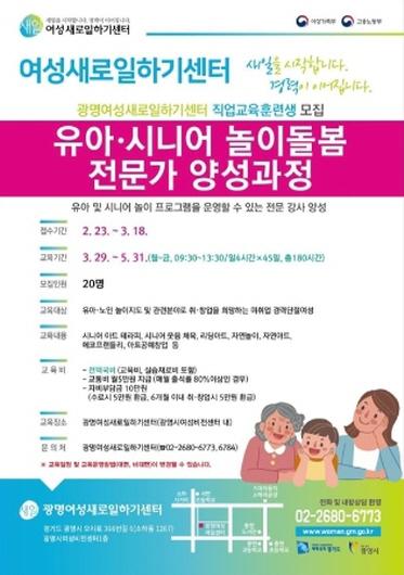 [뉴스시선집중, 박광옥기자] 광명시 여성새로일하기센터에서는 23일부터 3월 18일까지 직업 교육 훈련 ‘유아·시니어 놀이돌봄 전문가 양성 과정’ 신청자를 모집한다.