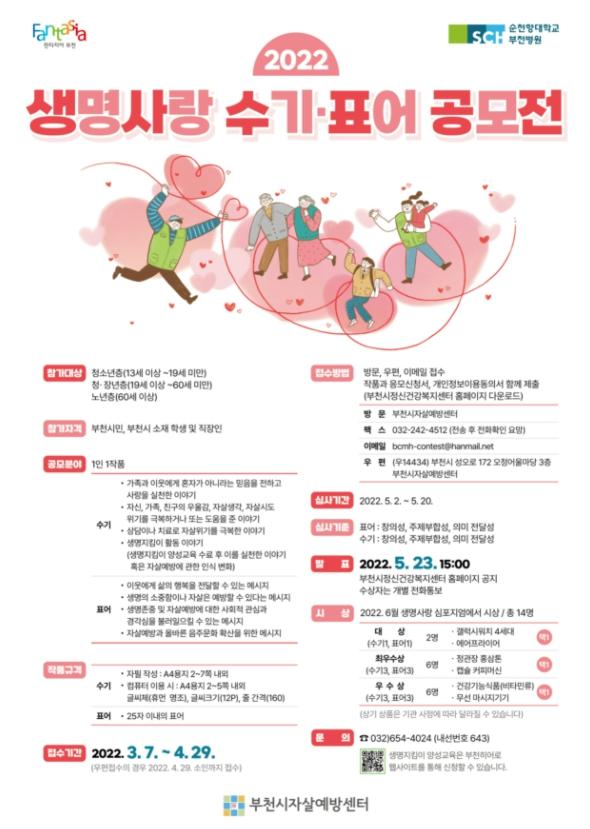 지난 2016년부터 시작되어 올해로 7회를 맞이한 생명사랑 수기·표어 공모전은 14세 이상 부천시민(부천시 소재 학생 및 직장인 포함) 누구나 참여할 수 있다.