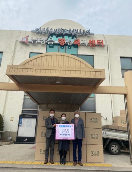 11일 남양읍 행정복지센터에서 열린 마스크 전달식에는 김문수 남양읍장과 김민 민성 대표이사, 장석환 찾아가는복지팀장 등이 참석한 가운데 진행됐다.