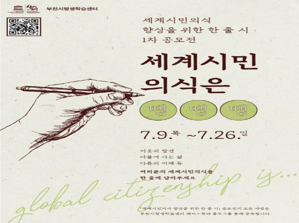 부천시민이라면 누구나 세계시민의식의 개념과 필요성을 주제로 한 ‘한 줄 시’를 적어 7월 9일부터 26일까지 온라인으로 응모할 수 있다.