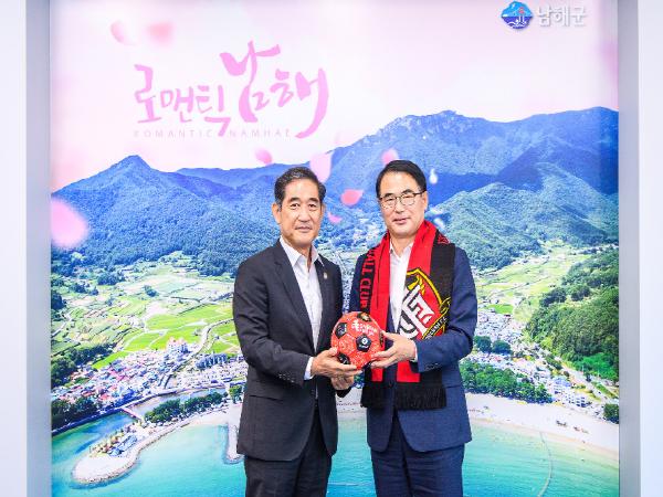 또 이날 환담 자리에 함께 참석한 박규진 남해군체육회장과 최청기 남해군축구협회장은 경남FC 홈경기를 남해군에서 개최해 남해군민들이 프로축구 경기를 가까이에서 관람할 수 있도록 해달라고 요청했다.
