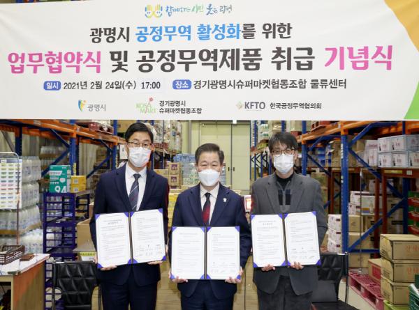 광명시는 24일 경기광명시슈퍼마켓협동조합 물류센터에서 경기광명시슈퍼마켓협동조합, (사)한국공정무역협의회와 공정무역 활성화를 위한 업무 협약식과 공정무역제품 판매 기념식을 가졌다.