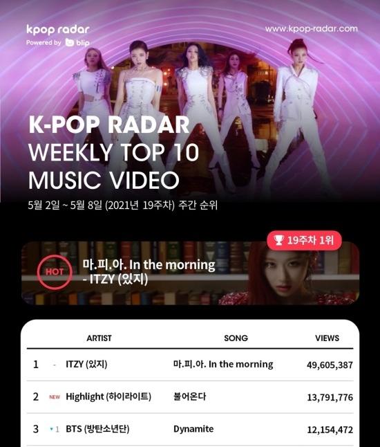 있지의 ‘마.피.아 In the Morning(마피아 인 더 모닝)’ 뮤직비디오는 케이팝 레이더 19주차 집계 기간 (5월 2일 ~5월 8일) 동안 4,960만 뷰를 기록하며, 1위의 자리를 지켰다.