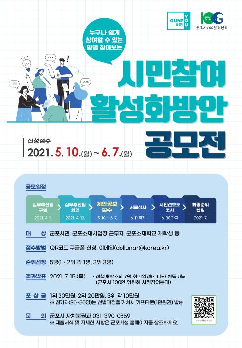 군포시 민관협치기구인 100인위원회 산하 시정참여분과 정책개발소위와 기획예산담당관은, 시민들의 정책개발 참여와 지속적인 관심을 유도하기 위한 ‘시민참여활성화방안 공모전’을 개최할 예정이다.