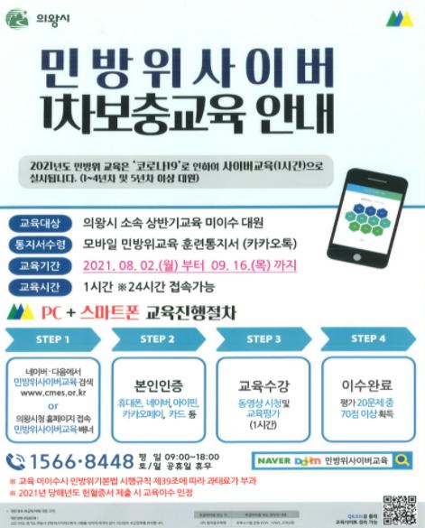 [뉴스시선집중, 박광옥기자] 의왕시는 상반기 민방위교육 미이수 대원을 대상으로 오는 9월 16일까지 사이버교육(1차 보충)을 실시한다고 밝혔다.