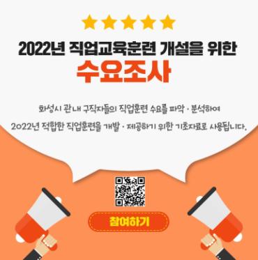 화성여성새로일하기센터(화성시여성가족청소년재단 운영)는 2022년 직업교육훈련 개설을 위해 수요조사를 진행한다고 밝혔다. 화성새일센터는 수요조사를 통해 직업교육훈련 선정 타당성의 근거를 마련하고, 관내 기업체와 지역 주민들의 구인·구직수요를 파악하여 지역사회 맞춤형의 직업교육훈련 과정을 선정하고자 한다.
