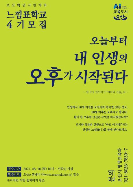 [뉴스시선집중, 박광옥기자] 오산시는 신중년 대상 평생학습 장기프로젝트 '오산백년시민대학 느낌표학교' 4기 신입생을 모집한다고 4일 밝혔다.