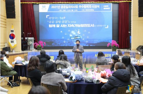 이날 행사에는 박승원 광명시장이 참석해 공공일자리 참여자 49명에게 표창장을 수여했으며, 행사는 코로나19 방역수칙을 철저히 지켜 진행했다.